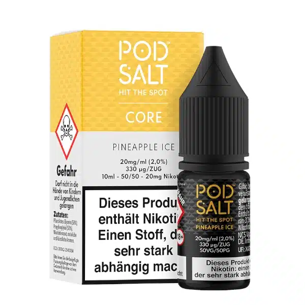 Pod Salt Pineapple Ice 20 mg ist ein Nikotinsalz Liquid mit reifem Ananasgeschmack, kombiniert mit einer klaren Ice-Frische. Intensiv im Aroma, weich im Zug – ideal für Pod-Systeme und MTL.
