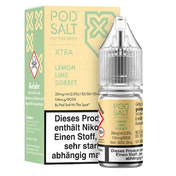 Pod Salt XTRA Lemon Lime Sorbet 20 mg ist ein Nikotinsalz Liquid mit spritziger Zitrone und frischer Limette im sorbetartigen Stil. Intensiv, erfrischend und ausgewogen. Ideal für Pod-Systeme und MTL-Geräte.